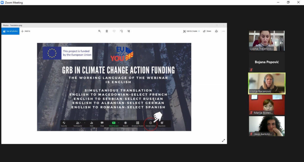 Vebinar: Rodna ravnopravnost i klimatske promene, u organizaciji Mreže za praćenje rodno odgovornog budžetiranja (Gender Budget Watchdog Network) je održan 13. jula na Zoom platformi. Događaj koji je pratilo više od 100 učesnika i učesnica su otvorile Marija Risteska, regionalna direktorka GBWN projekta i Irena Ivanova, menadžerka u Delegaciji EU u Severnoj Makedoniji.